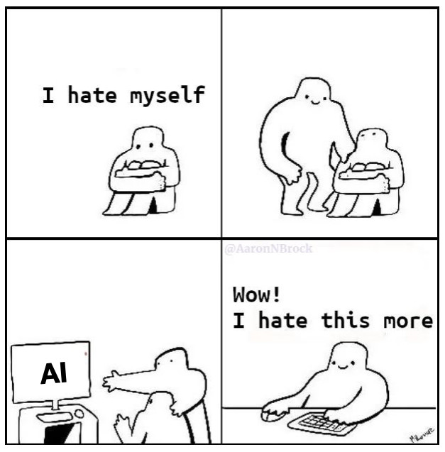 Lite mer radikal är Nikke Lindqvist, som skriver om sin spontana reaktion när hans blogg föreslår att han ska överlåta skrivandet till ”AI”. Bilden han vald illustrerar även mina känslor just nu (och därför snor jag den hit).