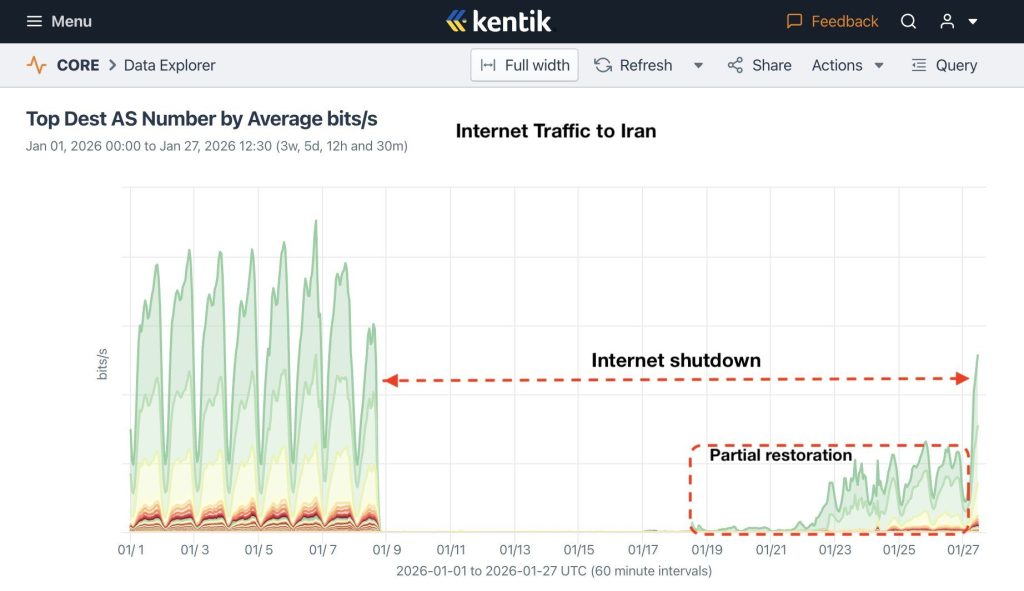 Det är verkligen solklart. När protesterna i början av januari blev regimen övermäktiga så började man först dra ner möjligheten att ansluta ut från landet, innan man natten mot den nionde januari helt ryckte ut sladden. Tio, tolv dagar senare började internet åter kopplas på. Troligtvis som resultat av kombinationen att protesterna slagits ner och kostnaden för att hålla landet bortkopplat kommit att öka.